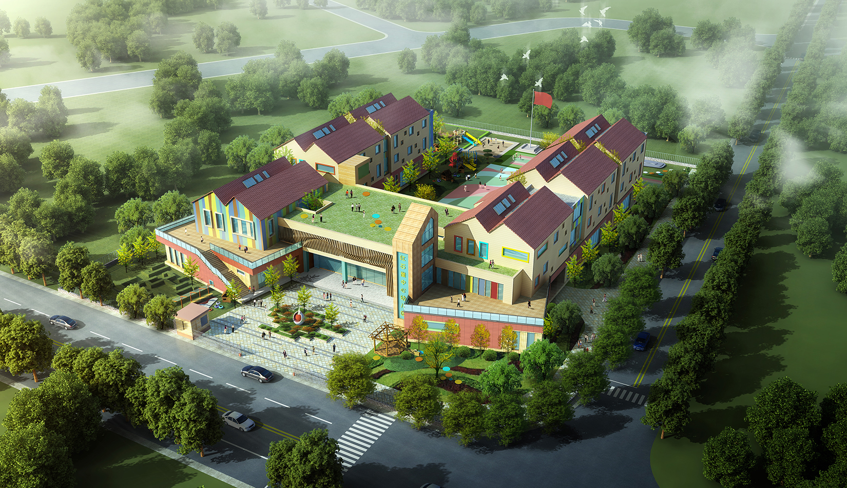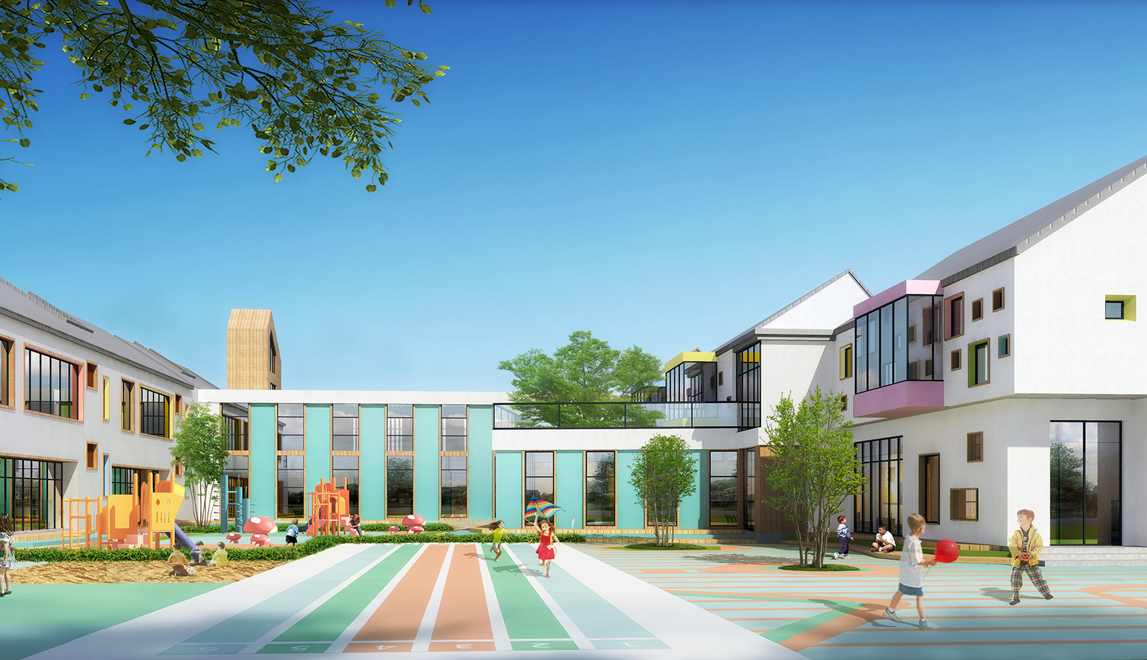 建筑造型來源于兒童最初對(duì)房子的印象并進(jìn)行延伸,加上積木搭接形態(tài),形成C字形圍合的主體建筑,就像父母溫暖的懷抱;建筑造型跟兒童產(chǎn)生很好的親切感,讓兒童將上幼兒園成為快樂的事情。同時(shí)形態(tài)結(jié)合地緣文化特色,采用雙折坡屋頂,寓意展翅翱翔的海鷗。