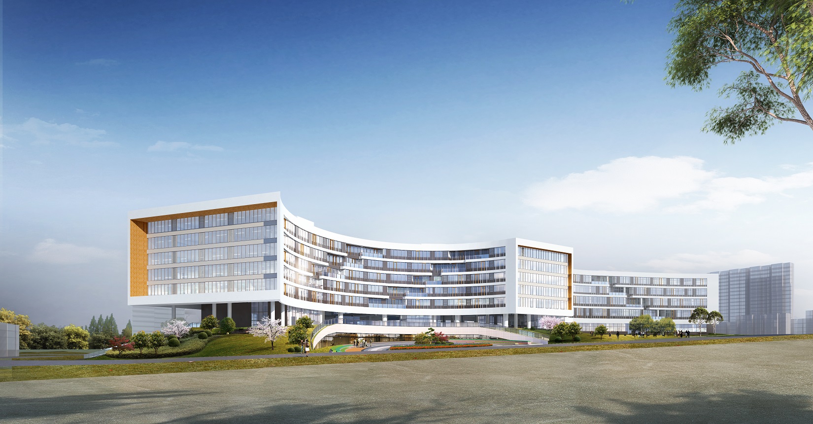 考慮到用地形狀、使用功能和日照等條件因素的影響,總平面布局以“生長”為主題,寓意生命向上生長的力量,生生不息,無限伸展。枝杈無限分支向上生長,象征著無限的力量與生機。而中醫(yī)的健康講究氣血通暢,循環(huán)往復,從而衍生出“五行”相輔相成的設計理念。根據五行方位確定五行主題。將金水湖與建筑相融合,金水湖為“水”,輔“金”“木”“火”“土”四個主題廣場。
